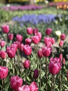 Keukenhof is a perfect example of a “show garden.” Flowers are placed in stunning and artistic displays within a park setting.  Due to a few clever planting techniques, flowers are in bloom for the entire time the garden is open, so you never have to worry about timing.