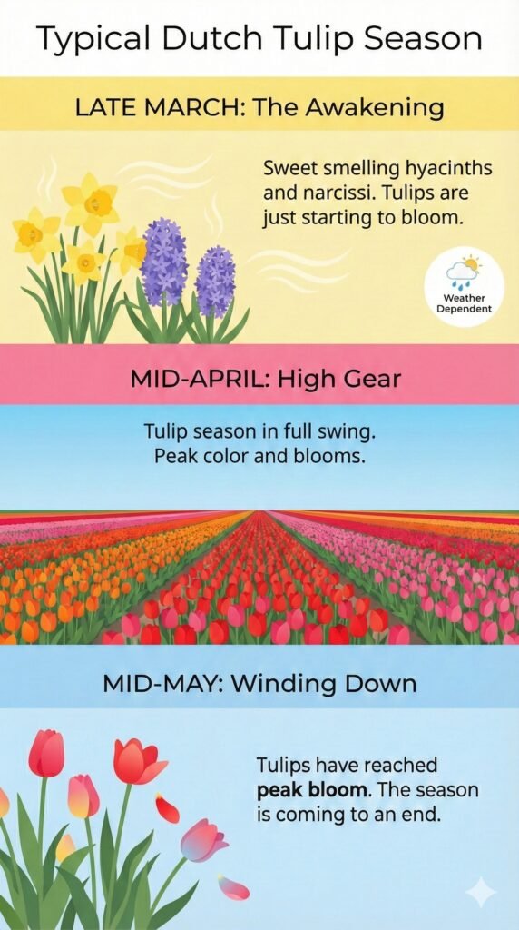 The easy answer is that tulip season occurs from the end of March to mid-May. That gives you a travel window of about seven weeks, but keep in mind that the “peak” bloom is entirely up to Mother Nature.